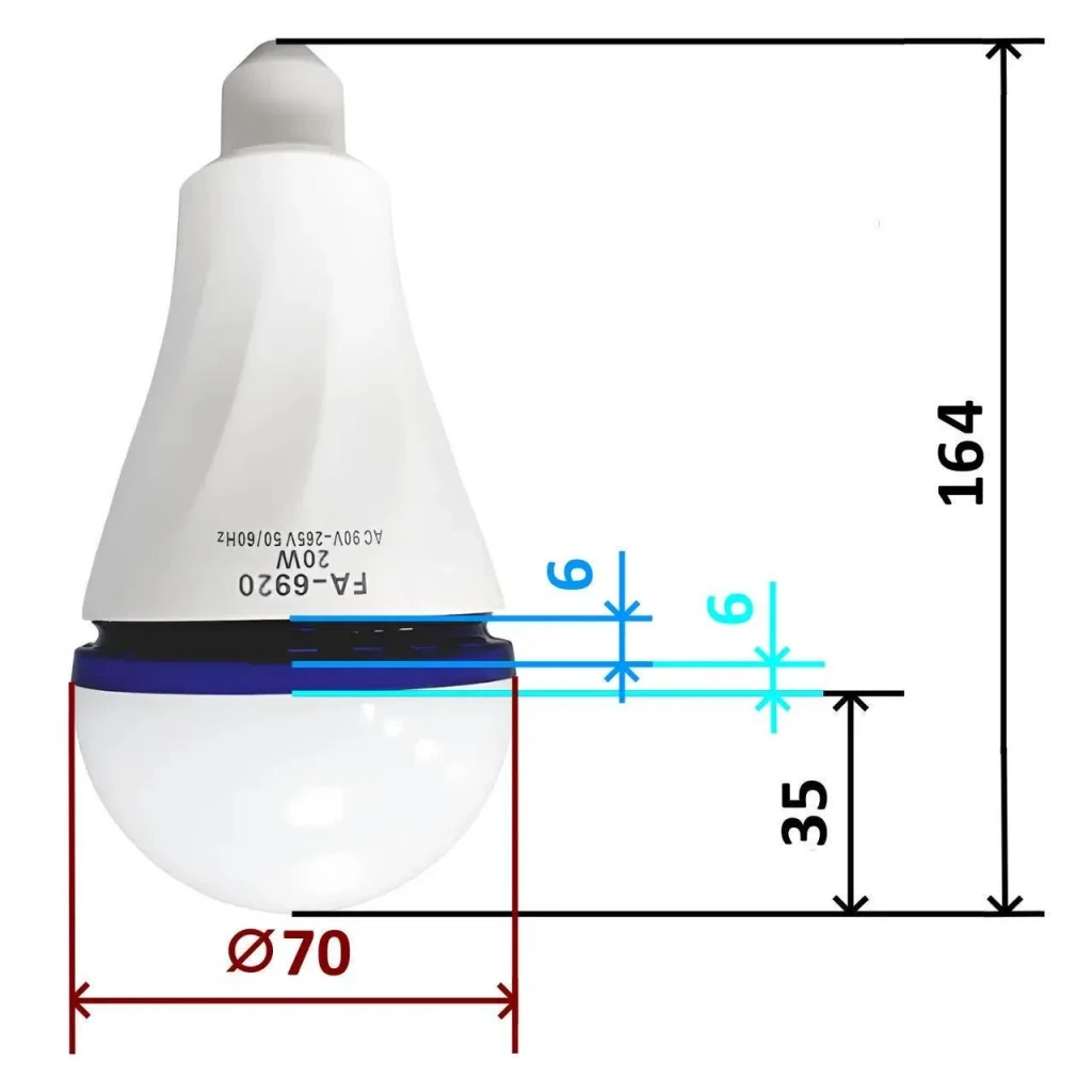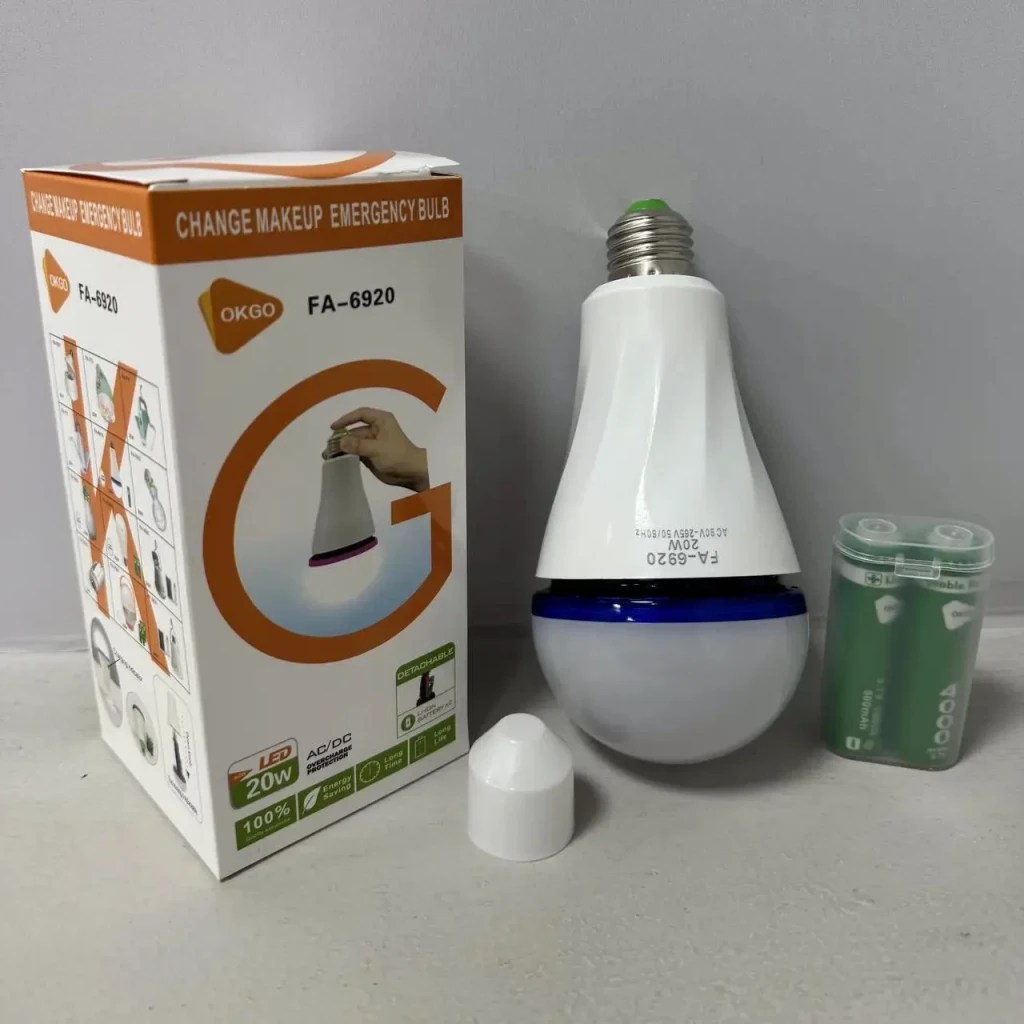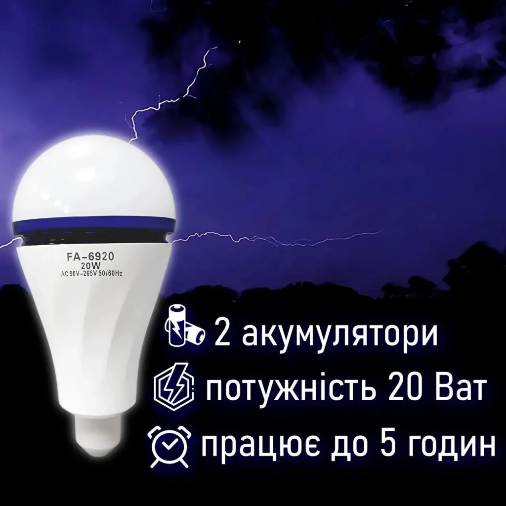 Лампа акумуляторна FA-2920 світлодіодна E27 20W 6800 К автономна аварійна, з двома змінними акумуляторами 18650 в комплекті. Підсвічується приємним "неоновим" світлом. Крім стандартного використання в лампах, люстрах, якщо купити звичайний патрон приєднати 2 шматки дроту, проводи замкнути, то дану лампу можна відмінно використовувати на природі, як кемпінговий ліхтар. Також заряджену лампочку можна використовувати як ручний ліхтарик: викрутіть її, охопіть рукою цоколь і водночас нижню металеву частину. Лампочка світитиме. Має два режими: - працює як звичайна лампа від мережі 220В - працює від вбудованого акумулятора під час знеструмлення мережі 220В (до 3 годин автономної роботи) Інструкція з використання: Лампа заряджається при роботі від мережі 220В. При знеструмленні мережі лампа запускається автоматично, якщо положення стандартного вимикача до якої він підключений у положенні "увімкнено". Управління лампою здійснюється за допомогою стандартного вимикача, якого вона підключена.