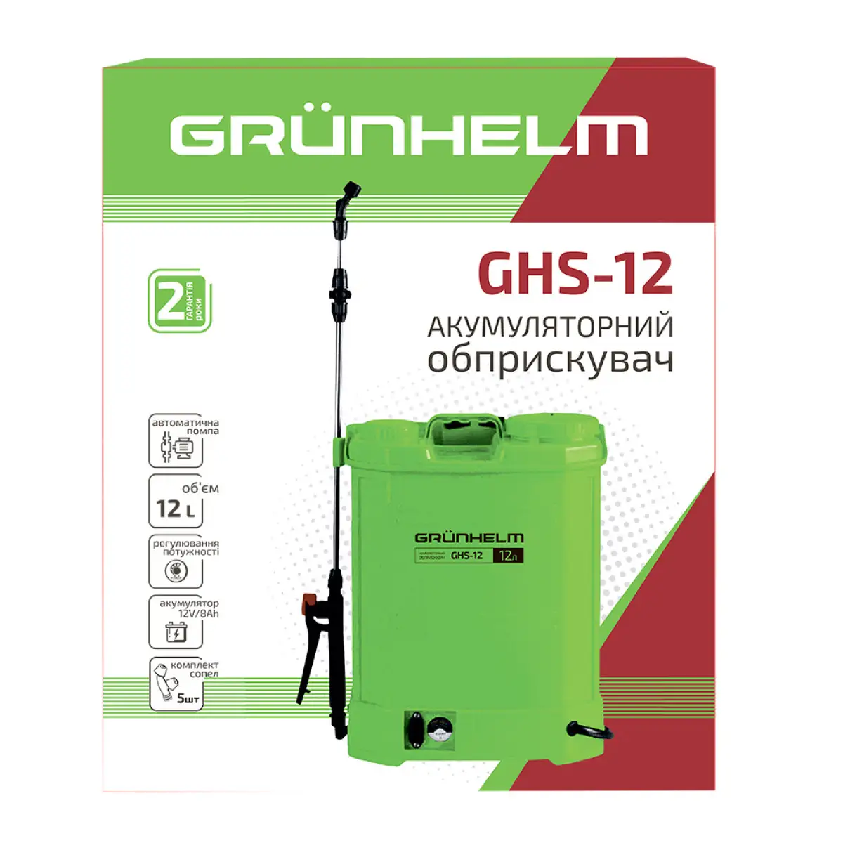 - Оприскувач акумуляторний GRUNHELM GHS-12 (8AH/12V, 2-4бар, 12л)