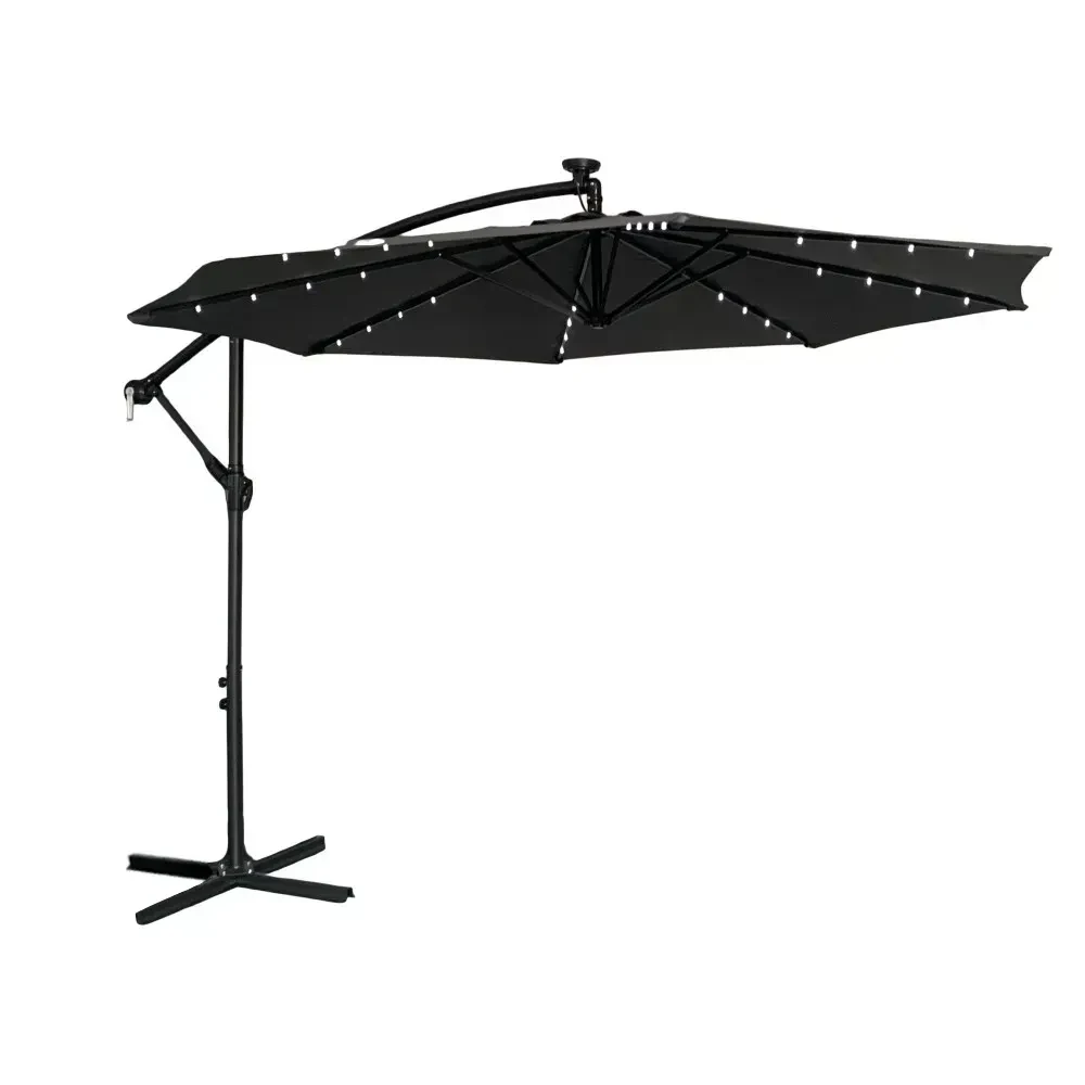 Головний шар парасолі виконано з поліестеру, який зустрічається у звичайних побутових парасольках, проте має підвищену щільність. Краплини води стікатимуть без промокань, Пекуче сонячне проміння залишиться на зовнішній стороні, а шар мокрого снігу на поверхні не зможе завдати суттєвої шкоди. Найчастіше споживачі приймають рішення замовити парасоль садову за її помірно яскраву теплого кольору підсвітку. 32 неперевершених лампи, що живляться від сонячної панелі одразу створюють бажану атмосферу. Якщо потреба у парасолі наразі зникла, належне тимчасове зберігання допоможе підтримати спеціальний чохол, що поставляється в комплекті.