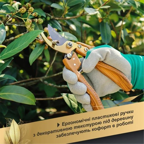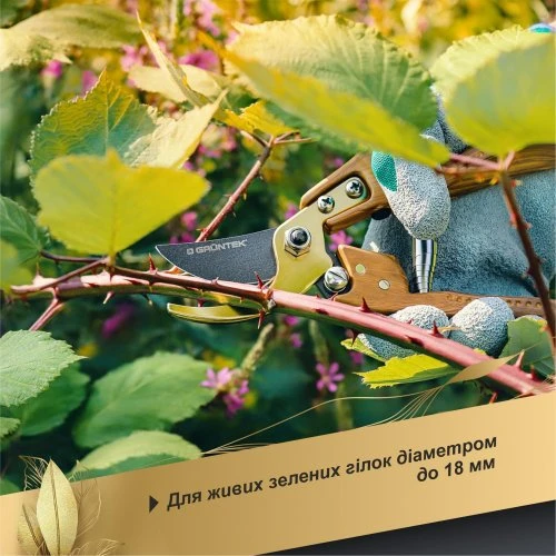 Секатор GRUNTEK PROFI Black Forest Edition в кобурі - садовий інструмент для обрізання живих гілок діаметром до 18 мм. Головною особливістю цієї моделі секатора є пластикові ручки, стилізовані під натуральну деревину, ергономічної форми, зручні для роботи лівою і правою рукою, а також - наявність кобури з натуральної шкіри.