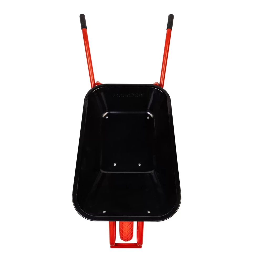 Важлива перевага для більш серйозних навантажень — це безкамерне поліуретанове колесо. Завдяки йому вам не доведеться турбуватися про проколи, адже воно не боїться цвяхів, уламків та інших гострих предметів, які часто зустрічаються на будмайданчику. Рама і кузов, покриті порошковою фарбою, надійно захищають тачку від механічних пошкоджень і погодних умов.