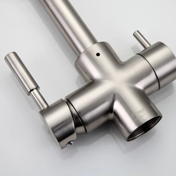 Змішувач для кухні Frap F4352-5 - це пристрій, призначений для підключення до осмосному фільтру. Змішувач має в конструкції додатковим важелем управління, який дозволяє включати відфільтровану воду окремо від тієї, що надходить з водопроводу. Має Г-подібний гусак, який обертається навколо своєї осі. Така форма не зрізає кут, тому під приладом з'являється багато додаткового простору. У той же час він досить довгий, щоб під ним було комфортно працювати.
