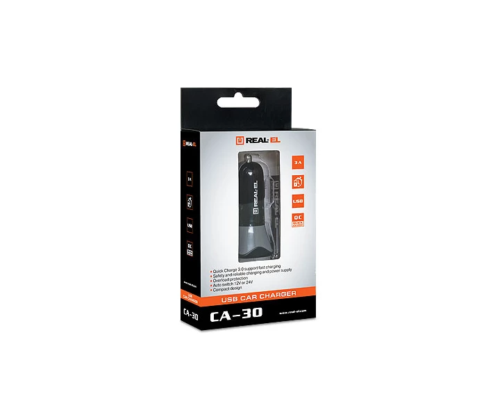 Автомобільний зарядний USB-пристрій REAL-EL CA-30 з одним виходом призначено для живлення та заряджання акумуляторів портативних пристроїв (мобільних телефонів, смартфонів, GPS-навігаторів, MP3-плеєрів, КПК, планшетних комп’ютерів та інших цифрових пристроїв) через гніздо прикурювача від бортової мережі автомобіля.