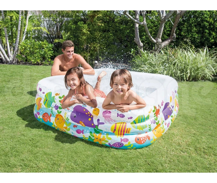 Дитячий надувний басейн 57471 NP «Акваріум» від відомої торгової марки "Intex" - ідеальний варіант для спекотних літніх днів. Якщо у вас є заміський будинок - тоді ця надувна іграшка стане порятунком від літньої спеки та веселою забавою для ваших малюків. Дитячий басейн «Акваріум» - це багато годин веселих ігор у воді. Яскравий принт надувного виробу, що зображає картину підводного світу з різнокольоровими рибками, медузами, коралами, восьминогами та іншими морськими мешканцями, припаде до смаку маленьким дітям. Басейн складається з 3-х самостійних повітряних камер, кожна з яких обладнана власним подвійним клапаном. Обсяг води становить 344 літри - а цього, більш ніж достатньо для швидкого нагріву і веселої гри діточок від 3-х років. Попри те, що басейн дитячий, не варто залишати малюка одного без нагляду. Для швидкого осушення, модель обладнана клапаном для зливу води. Товщина матеріалу стінки - 0,30 мм. Розміри / габарити - Довжина (см): 159 см - Ширина (см): 159 см - Висота (см): 50 см Розмір упаковки: 35.5 см × 31 см × 9.5 см * Характеристики та комплектація товару можуть змінюватися виробником без повідомлення