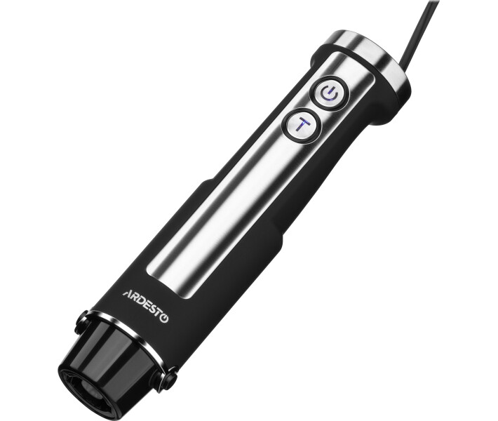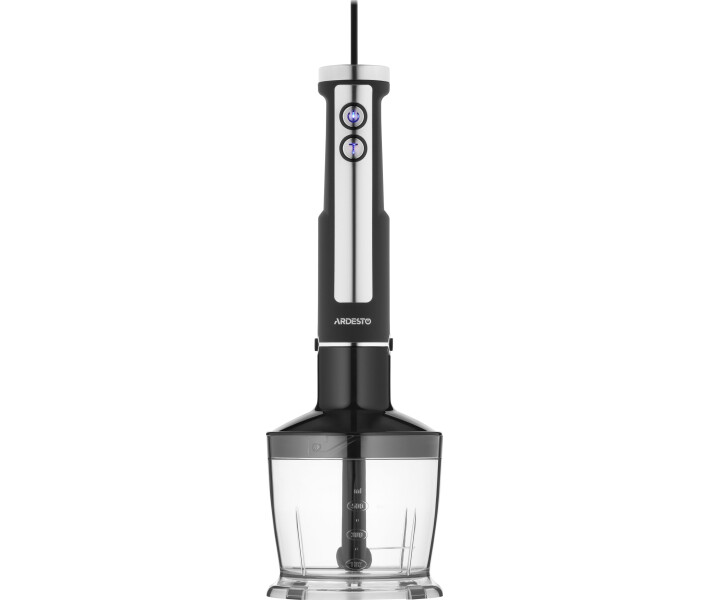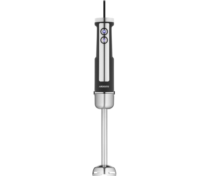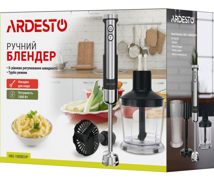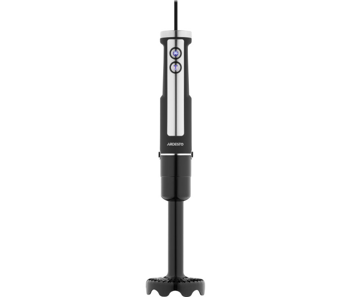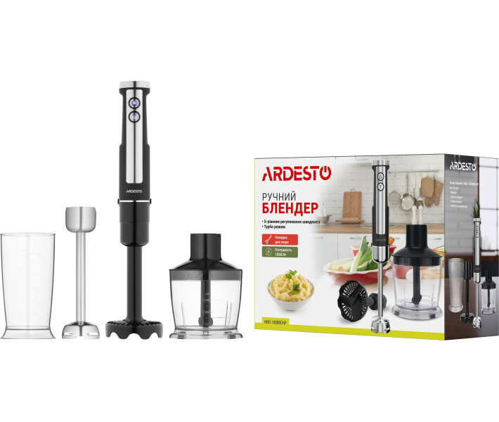 Занурювальний блендер ARDESTO HBG-1000BCHP чорно-сріблястого кольору згодиться для швидкого приготування коктейлів, смузі, соків і різноманітних соусів. Оснащений двигуном потужністю 1 000 Вт із низьким рівнем шуму, двома режимами роботи (звичайний і турбо) і п’ятьма швидкостями. До того ж доступні три функції приготування продуктів: змішування, подрібнення, збивання. Пристрій має тонке ергономічне руків’я зі спеціальним протиковзким покриттям і підсвічуванням кнопок керування. Лезо виготовлено з нержавіючої сталі, на ніжці передбачено захист від розбризкування. У комплекті є мірна чаша об’ємом 600 мл, подрібнювач (500 мл) і насадка для пюре. Довжина кабелю живлення становить 1,3 м.