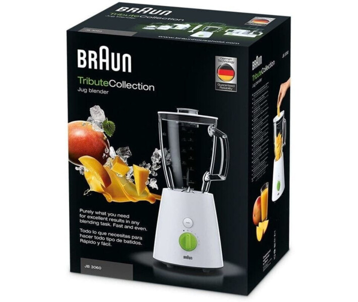 Блендер Braun JB 3060 WHITE – це надійний та функціональний кухонний прилад, який стане незамінним помічником у приготуванні різноманітних страв. Він має потужний двигун потужністю 800 Вт, який дозволяє легко роздроблювати, вбивати та змішувати різні інгредієнти. У комплекті постачається скляний кувшин на 1,75 літра, що зручно для приготування великих порцій. Блендер Braun JB 3060 WHITE оснащений ножем з високоякісної нержавіючої сталі, який легко справляється навіть з найтвердшими продуктами та з льодом. Пристрій має 5 режимів роботи, що дозволяє вибрати оптимальну швидкість в залежності від завдання. Зручна кнопка пульсації робить контроль процесу блендування простим та зручним. Цей блендер має стильний та ергономічний дизайн, який буде виглядати чудово в будьякій кухні. Крім того, легке чищення та зручність використання роблять його ідеальним вибором для зайнятих людей та професійних кухарів. Купуйте блендер Braun JB 3060 WHITE та відкрийте нові можливості в кулінарії!