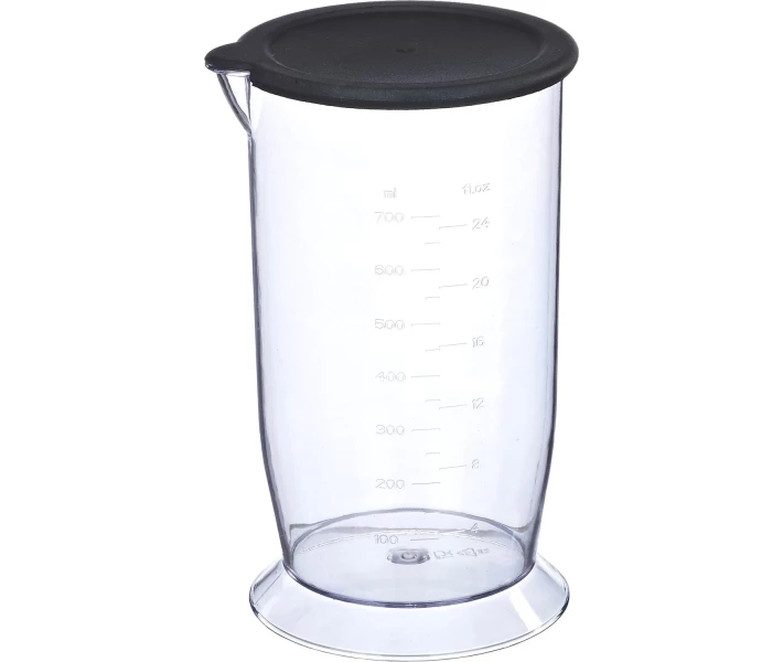 Корпус блендера виконаний із міцного пластику, а нога та лезо виготовлені з нержавіючої сталі, що забезпечує довговічність та надійність використання. У комплект також входить склянка об'ємом 700 мл із пластиковою кришкою, яка зручна для приготування та зберігання різних сумішей та напоїв.