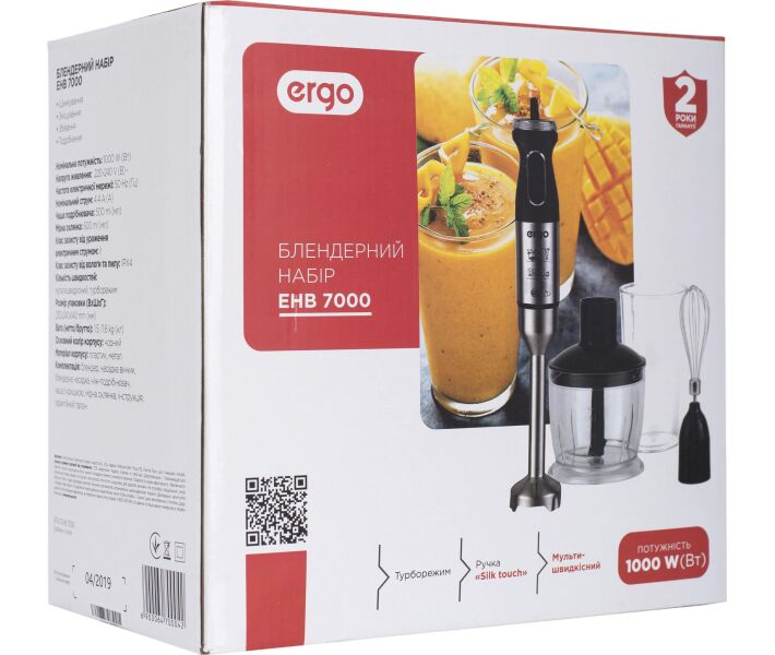 Блендер Ergo EHB 7000 відмінно укомплектований. Насадка-віночок дозволяє ретельно змішувати рідкі компоненти, збити омлет або приготувати тісто на млинці. Погружная металева насадка дозволить приготувати ніжний крем-суп, її навіть можна занурювати в гарячу середу. Закрита хащі дає можливість акуратно і безпечно подрібнити абсолютно будь-які інгредієнти. Мірний стакан допоможе відміряти необхідну кількість продукту і послужить зручною ємністю для збивання і зберігання продуктів.