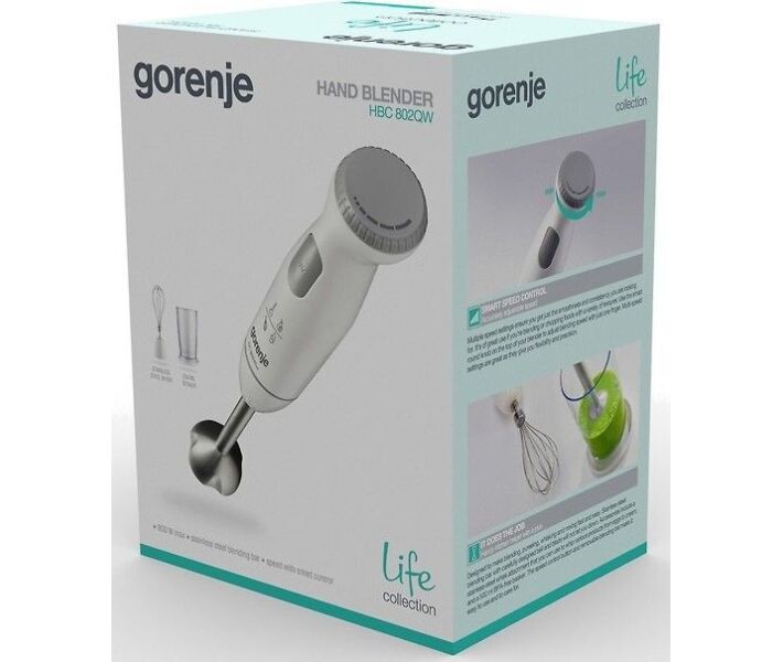 Gorenje HBC802QW має кілька складових частин в пристрої. Так, прилад складається з робочої ніжки, на якій знаходиться панель управління, є також погружная насадка, насадка-віночок і мірний стакан на півлітра. Споживана потужність пристрою становить 800 Вт. Всі насадки виконані з нержавіючої сталі.