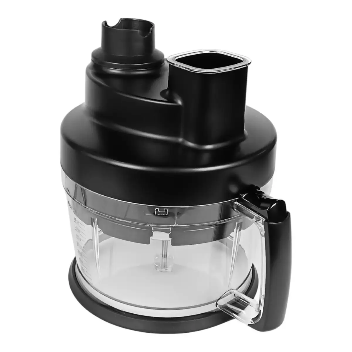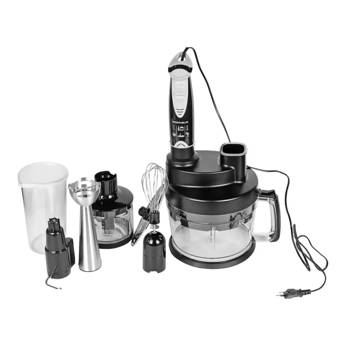-корпус блендера з електродвигуном -Чаша з ножем – 400 мл -склянка з кришкою - 600 -Насадка для нарізки кубиками 8х8 мм -Крюк для замішування тіста -віночок для збивання -Диск для подрібнення та нарізки
