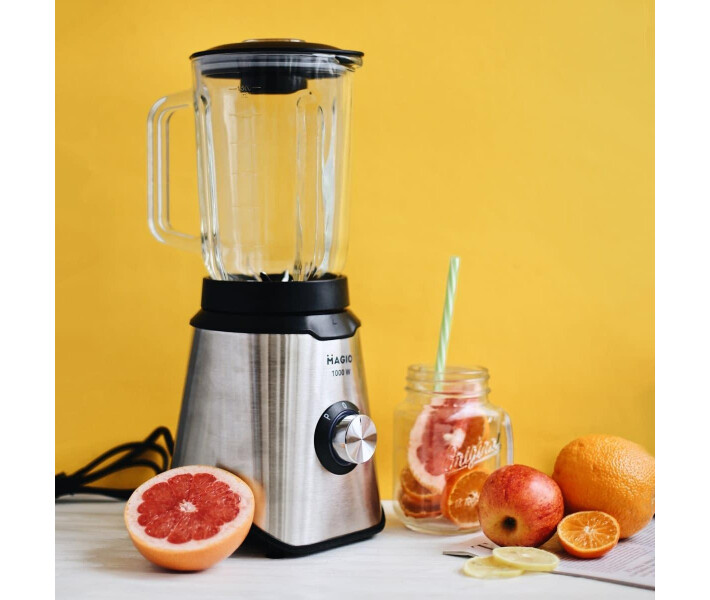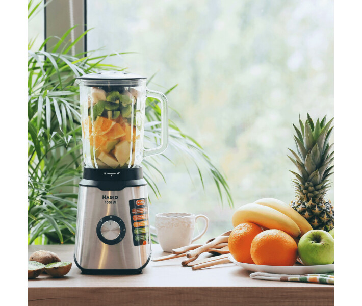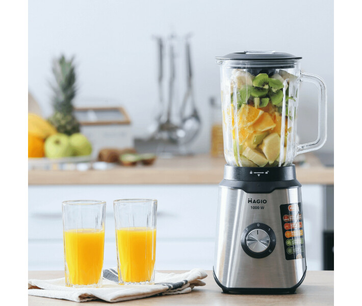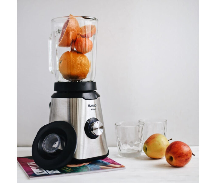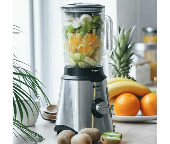 Настільний блендер Magio MG-651 1000W зі скляною чашею стаціонарний подрібнювач. Одним із незамінних кухонних помічників є стаціонарний блендер Magio MG 651. Потужність 1000 Вт дозволяє з легкістю подрібнювати їжу, в тому числі, варене. За допомогою шестилопатевого ножа з нержавіючої сталі кожна господиня легко і швидко може приготувати пюре, тісто та емульсії, збити різні коктейлі та інші напої, муси, соуси та приготувати багато інших звичних та екзотичних страв. Блендер навіть допоможе колоти кригу для холодних напоїв. Прогумовані ніжки не дадуть приладу ковзати поверхнею під час роботи. Корпус із нержавіючої сталі та захист від перегріву продовжать службу блендера. Низький шум під час роботи, перемикач режимів роботи з LED підсвічуванням та кришка зі знімним ковпачком забезпечать комфортне використання приладу.