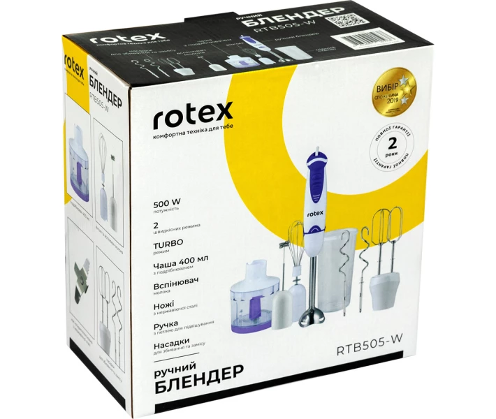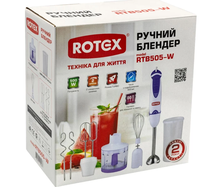 Проводьте час за улюбленою готуванням, використовуючи допоміжний прилад- блендер Rotex RTB505-W. Він допоможе подрібнити фрукти, овочі, зелень, приготувати пюре, швидко і красиво нарізати продукти на салат. Практичний і недорогий прилад, який стане незамінним пристроєм на вашій кухні. Він відкриє вам світ кулінарних шедеврів і подарує свободу дії. Виручить в разі несподіваного приходу гостей.