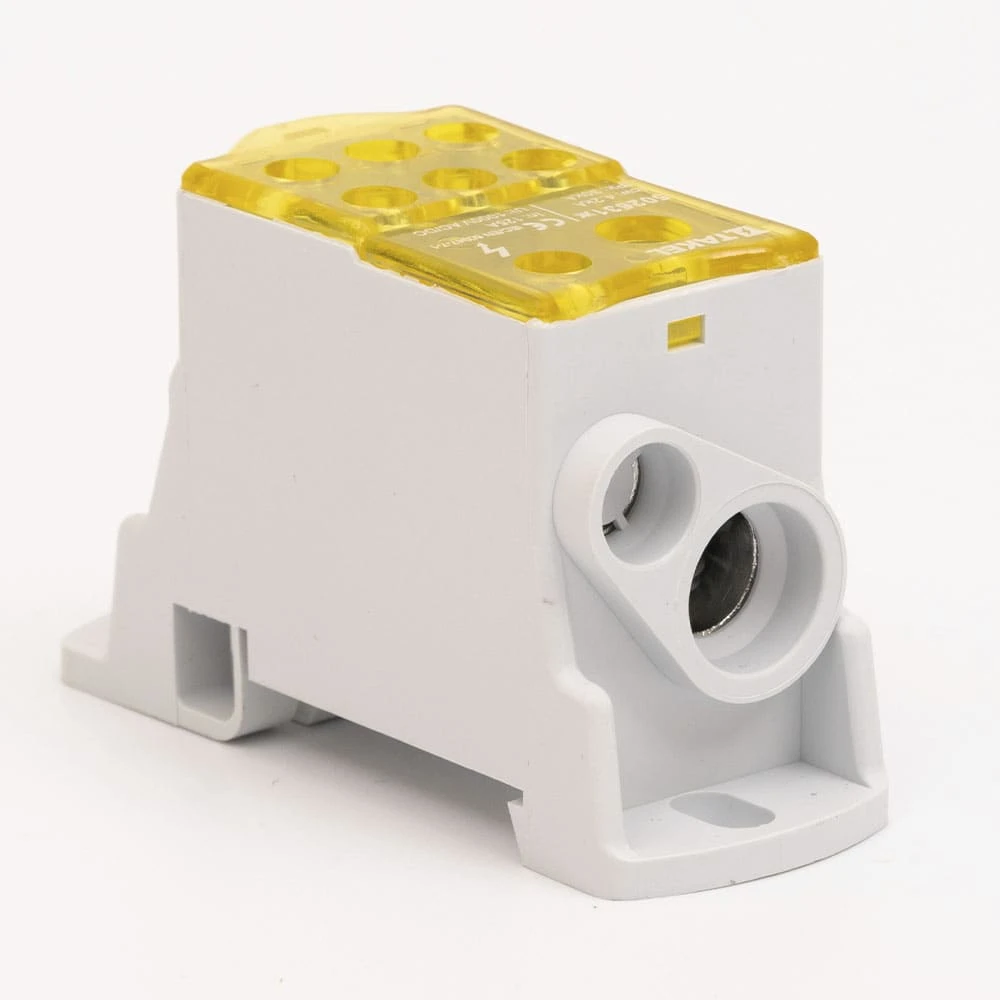Блок розподільчий на DIN‑рейку 125А жовтий TAKEL — це клемний розподільчий блок для монтажу на DIN‑рейку, призначений для якісного з’єднання одного живильного провідника з кількома відвідними в електрощиті та розподілу електричної енергії з номінальним струмом до 125 А та напругою до 1000 В.