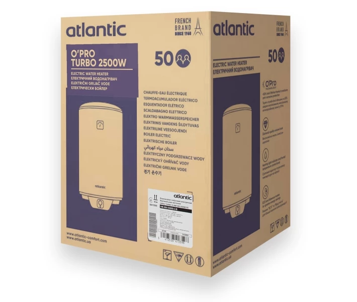 Водонагрівач Atlantic O'Pro Turbo VM 050 D400S-2-B (2500W) – це надійний та потужний бойлер, спеціально розроблений для бізнес-об'єктів, де потрібне постійне використання гарячої води. Він оснащений ТЕНом високої потужності – 2500 Вт, що дозволяє швидко та ефективно нагрівати великі об'єми води. Електричний класичний бойлер ПРО Турбо в оновленому та сучасному дизайні легко інтегрувати в інтер'єр будь-якого приміщення. Текстурований ефект на нижній кришці з матовим відтінком надає водонагрівачу елегантності та вишуканості, що робить його не тільки функціональним, але й стильним пристроєм. Анод із магнієвого сплаву відіграє ключову роль у запобіганні процесу корозії робочого резервуара та нагрівального елемента. Також інженери Atlantic впровадили інноваційну технологію під назвою Ohmic Protection (O'Pro), щоб забезпечити посилений захист пристрою. Кожна модель із серії O'Pro Turbo оснащена спеціальним елементом, розташованим між ТЕНом та анодом, який збільшує цикл життя аноду вдвічі. Така система значно скорочує необхідність у техобслуговуванні та допускає його проведення один раз протягом двох років. Важливо, що в серії O'Pro Turbo застосовується термоелемент із міді потужністю 2500 Вт, який гарантує експрес-нагрів води до 65 °C всього за 1 годину та 5 хвилин. Габаритні розміри пристрою – 581 433 455 мм, а його вага – 14,1 кг. Внутрішня ємність місткістю 46.7 літра забезпечена першокласною збагаченою цирконієм емаллю, забезпечуючи надійний захист від корозії та підвищену довговічність. Крім того, всі водонагрівачі серії O'Pro Turbo оснащені пінополіуретановим ізолюючим шаром, що суттєво знижує тепловтрати до 5-6 °C за повний день та гарантує довгострокове збереження тепла. Завдяки абсолютно безшумній роботі та зовнішньому регулюванню температури ви можете насолоджуватися тишею вашого будинку, не турбуючись про зайвий шум від роботи приладу, а також легко налаштовувати бажану температуру води. Температура води визначається за допомогою регулятора на передній панелі. Також до оновленої моделі додано можливість вибору Eco-режиму. У цьому режимі встановлюється температура 58 ± 2 °C, при якій нагрівання води найбільш ефективний при мінімальних витратах електроенергії. Atlantic гарантує високу якість своєї продукції, надаючи гарантійні зобов'язання на робочий бак серії OPro Turbo протягом 5 років та на електричну частину протягом 2 років. Придбати Atlantic Opro Turbo VM 050 D400S-2-B (2500W) Ви можете, оформивши замовлення у нас на сайті, а також по телефону гарячої лінії.