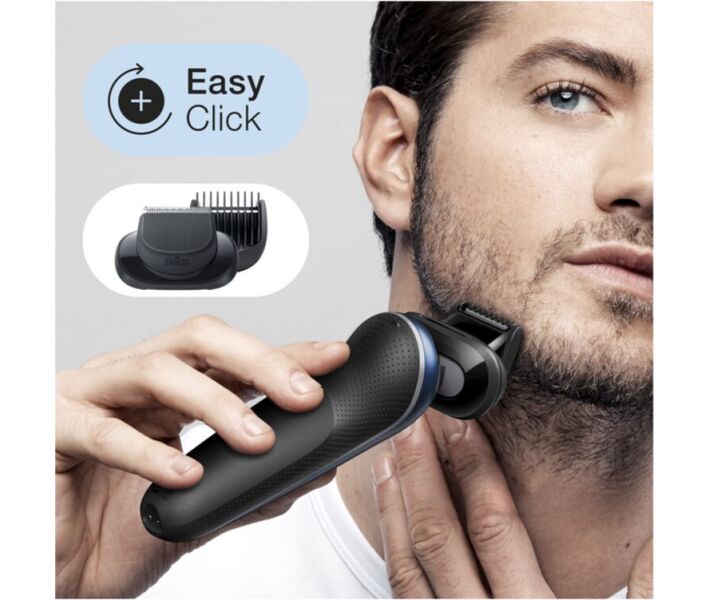 Потрійна бритвена система з технологією MicroComb і системою кріплення Easy Click; 2 бритвені сітки Senso Foil; Індикатор заряду акумулятора: 3 рівня; Знімна насадка Beard Trimmer (+ 5 насадок); Чохол з жорсткими стінками; Швидка зарядка: 5 хв; «Розумний» штекер для автоматичної настройки напруги від 100 до 240 вольт.