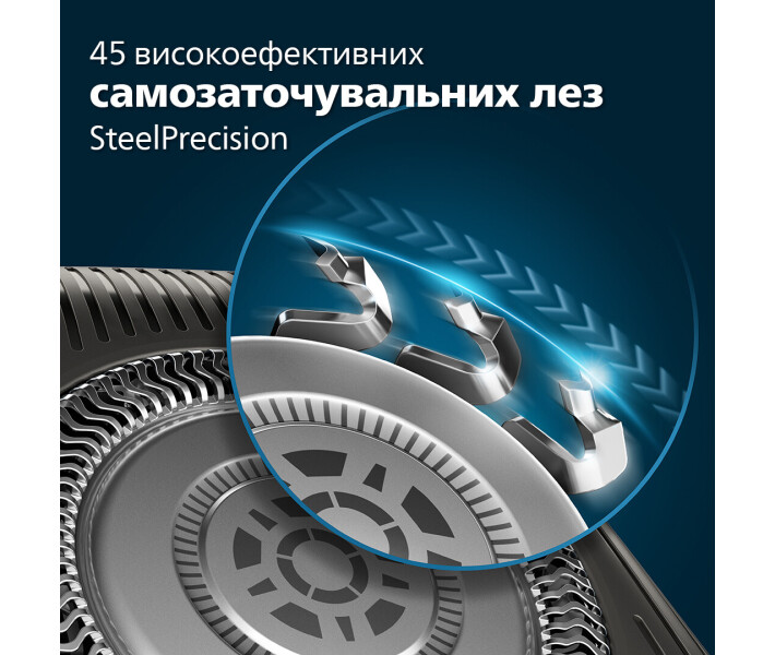 Леза SteelPrecision роблять 90 000 зрізань за хвилину, забезпечуючи ретельне гоління. 45 високоефективних лез, що самі заточуються і виготовлені в Європі.