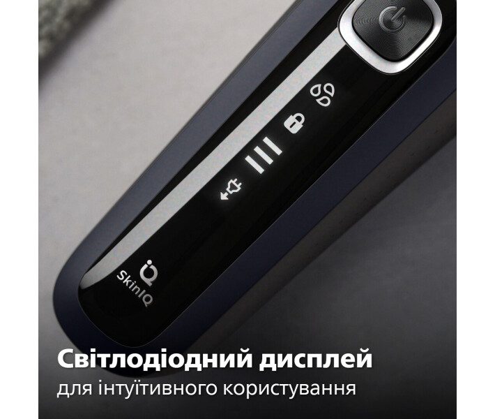 Інтуїтивний дисплей показує відповідну інформацію, забезпечуючи найкраще гоління. Цей інтерфейс включає: 3-рівні стану батареї, поради щодо чищення та індикатор блокування для транспортування.