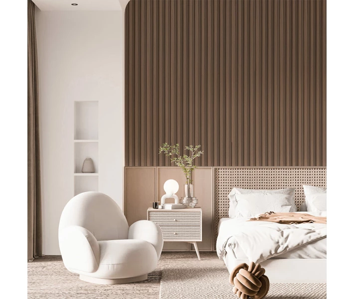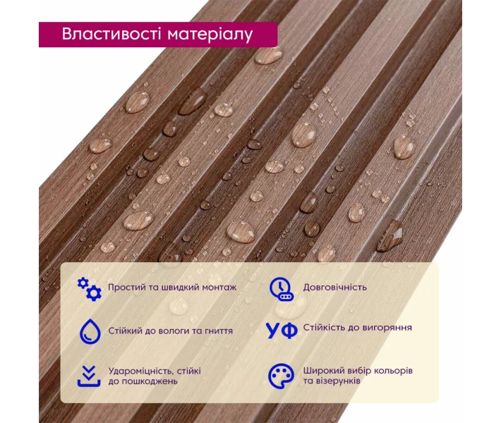 Властивості та переваги матеріалу: Стійкість до вологи: матеріал WPC має високу стійкість до впливу вологи, не набухає і не деформується. Стійкість до гниття та комах: на відміну від деревини, WPC не схильний до гниття і не приваблює комах. Стійкість до впливу ультрафіолету: стінові панелі WPC зберігають свій колір та структуру під впливом ультрафіолетового випромінювання. Привабливий зовнішній вигляд: декоративний шар імітує натуральне дерево, що дозволяє створювати стильні та естетичні інтер'єри, знижуючи при цьому використання чистої деревини. Простота обслуговування: стінові панелі WPC зазвичай не потребують складного догляду. Вони не вимагають фарбування, обробки антисептиками та формальдегідами, зберігають свій зовнішній вигляд протягом тривалого часу.