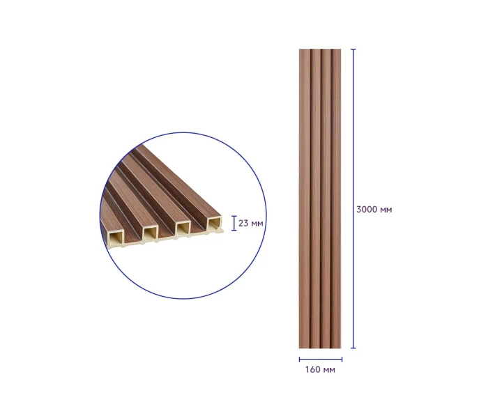 Опис: Стінові рейки WPC – будівельний матеріал для внутрішнього оздоблення, що імітує натуральну деревину.