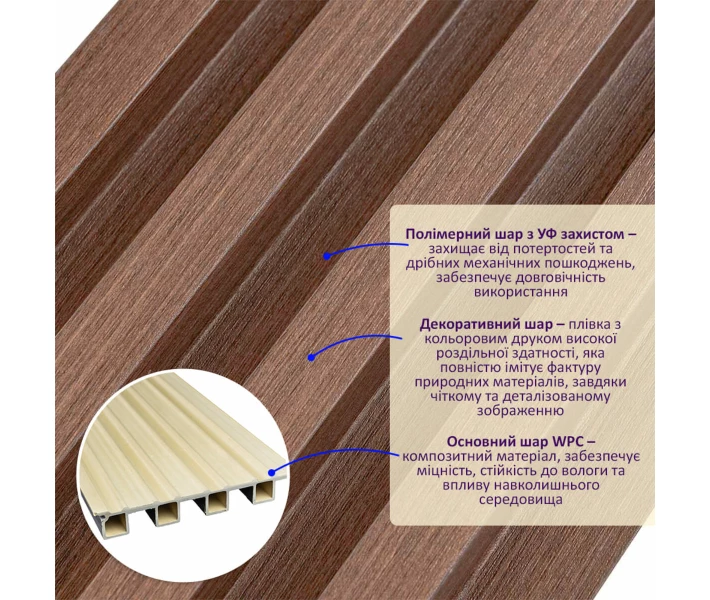Рейки складаються з наступних шарів: Полімерний шар, що захищає від потертостей та дрібних механічних пошкоджень, забезпечує довговічність використання, а УФ захист допомагає запобігти вигоранню, зберігаючи колір декоративного шару насиченим, за рахунок чого рейка довго має свій первісний естетичний вигляд. Декоративний шар: плівка з кольоровим друком високої роздільної здатності, яка повністю імітує фактуру природних матеріалів, завдяки чіткому та деталізованому зображенню. Основний шар WPC: є композитним матеріалом, який поєднує в собі деревні волокна (або стружку) з полімерними матеріалами, що забезпечує матеріалу міцність, стійкість до вологи і стійкість до впливу зовнішнього середовища.