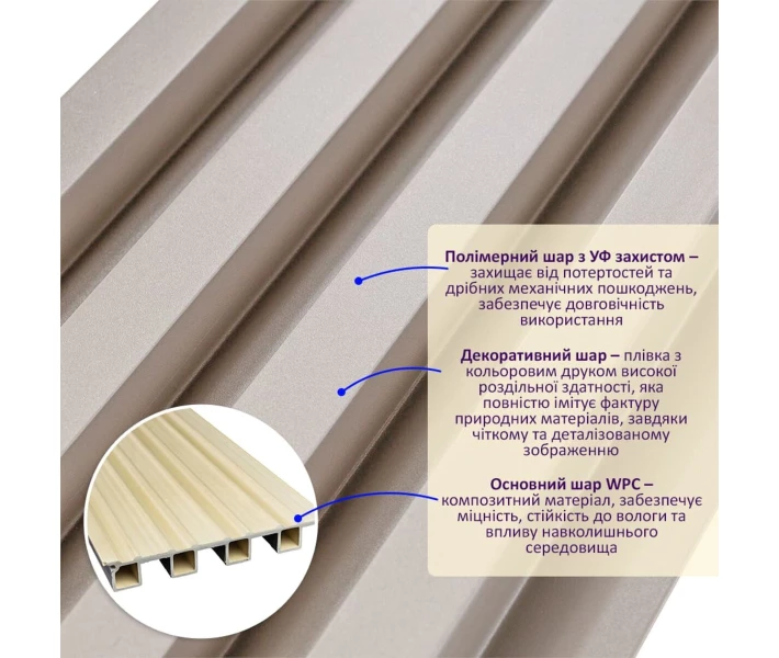 Рейки складаються з наступних шарів: Полімерний шар, що захищає від потертостей та дрібних механічних пошкоджень, забезпечує довговічність використання, а УФ захист допомагає запобігти вигоранню, зберігаючи колір декоративного шару насиченим, за рахунок чого рейка довго має свій первісний естетичний вигляд. Декоративний шар: плівка з кольоровим друком високої роздільної здатності, яка повністю імітує фактуру природних матеріалів, завдяки чіткому та деталізованому зображенню. Основний шар WPC: є композитним матеріалом, який поєднує в собі деревні волокна (або стружку) з полімерними матеріалами, що забезпечує матеріалу міцність, стійкість до вологи і стійкість до впливу зовнішнього середовища.