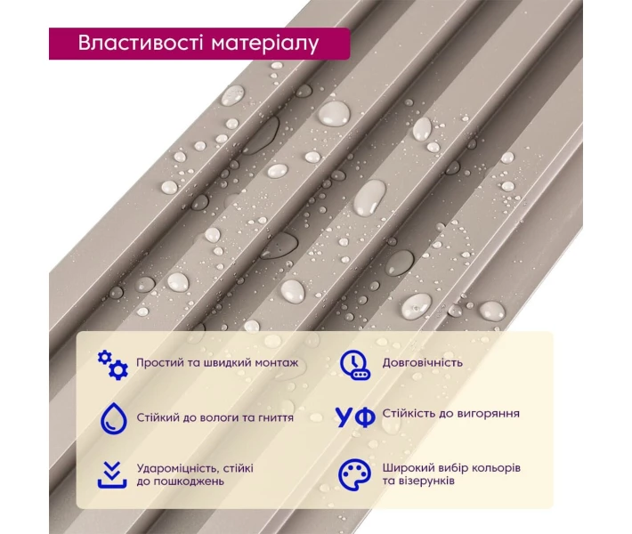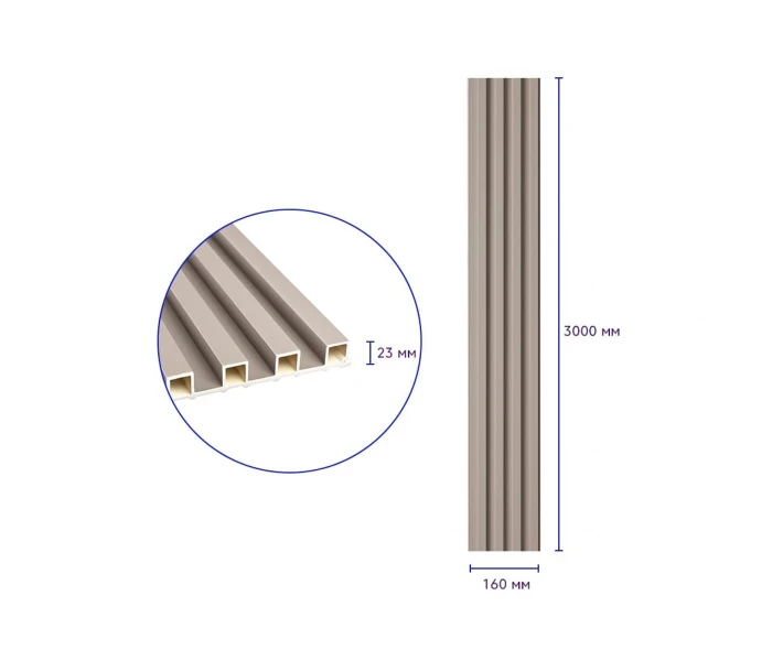 Властивості та переваги матеріалу: Стійкість до вологи: матеріал WPC має високу стійкість до впливу вологи, не набухає і не деформується. Стійкість до гниття та комах: на відміну від деревини, WPC не схильний до гниття і не приваблює комах. Стійкість до впливу ультрафіолету: стінові панелі WPC зберігають свій колір та структуру під впливом ультрафіолетового випромінювання. Привабливий зовнішній вигляд: декоративний шар імітує натуральне дерево, що дозволяє створювати стильні та естетичні інтер'єри, знижуючи при цьому використання чистої деревини. Простота обслуговування: стінові панелі WPC зазвичай не потребують складного догляду. Вони не вимагають фарбування, обробки антисептиками та формальдегідами, зберігають свій зовнішній вигляд протягом тривалого часу.