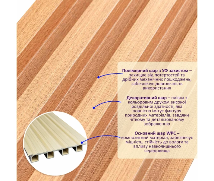 Рейки складаються з наступних шарів: Полімерний шар, що захищає від потертостей та дрібних механічних пошкоджень, забезпечує довговічність використання, а УФ захист допомагає запобігти вигоранню, зберігаючи колір декоративного шару насиченим, за рахунок чого рейка довго має свій первісний естетичний вигляд. Декоративний шар: плівка з кольоровим друком високої роздільної здатності, яка повністю імітує фактуру природних матеріалів, завдяки чіткому та деталізованому зображенню. Основний шар WPC: є композитним матеріалом, який поєднує в собі деревні волокна (або стружку) з полімерними матеріалами, що забезпечує матеріалу міцність, стійкість до вологи і стійкість до впливу зовнішнього середовища.