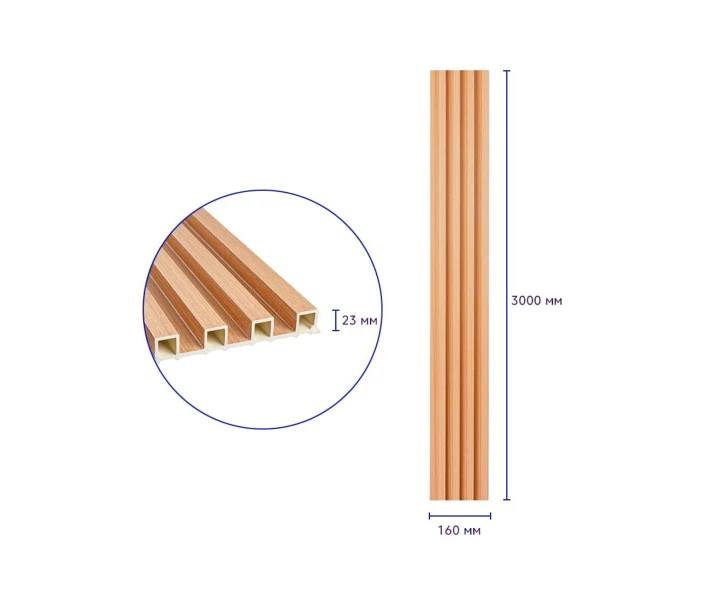 Опис: Стінові рейки WPC – будівельний матеріал для внутрішнього оздоблення, що імітує натуральну деревину.