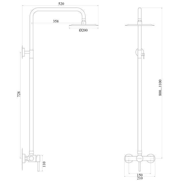 - верхній душ - кругла лійка ø20 см, стійка (80-110 см)