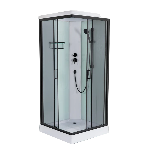 Душовий бокс Poli black - HL виділяється своїм сучасним мінімалістичним дизайном, де домінує чорний колір профілю та аксесуарів, що додає виробу елегантності. Тоноване переднє скло та контрастне біле заднє скло створюють цікавий візуальний ефект, підкреслюючи високий рівень якості матеріалів. Ефективно продумана система піддону забезпечує комфортний вхід і безпеку, а 2-х режимний змішувач дозволяє легко перемикатися між режимами верхнього та ручного душу.