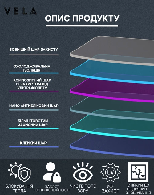 - 99% захист від УФ: Плівка блокує 99% ультрафіолетових та 88% інфрачервоних променів.