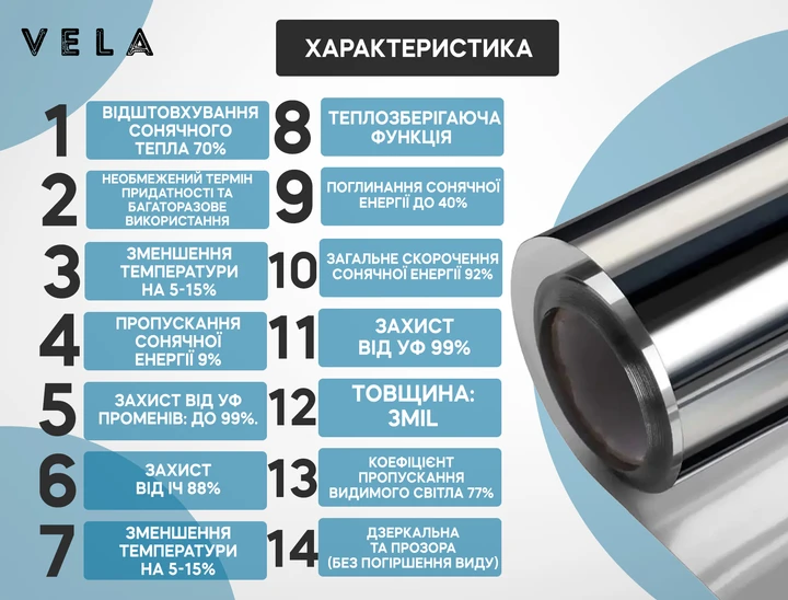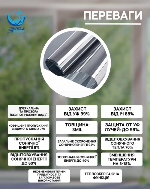 Плівка VELA – найновіша інноваційна металізована та сонцезахисна плівка з ефектом дзеркала, при цьому повністю прозора для комфортного використання в будь-якому приміщенні.