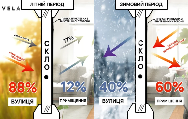 Останнім часом помітна тенденція застосування спеціального захисного матеріалу в офісних та торгових будинках, а також у житлових будинках. Багато мешканців вже давно не використовують штори, фіранки та фольгу для захисту від сонячних променів, вибираючи плівку. Вона має популярність через свою ефективність, стійкість і невидимість. Плівка покращує експлуатаційні характеристики скла, надаючи міцності та стійкості, робить його менш уразливим. Дзеркальна плівка Vela дозволяє знизити температуру в приміщенні, яке не захищене від сонця, на 5-15 градусів за допомогою інноваційної дзеркальної структури. Плівка, що складається з 6 шарів, забезпечує ефективний захист від інфрачервоного та ультрафіолетового випромінювання.