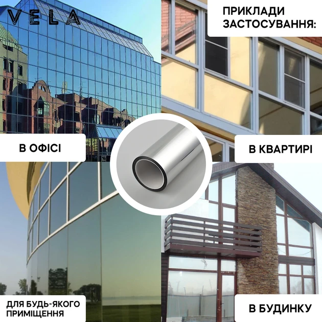 Плівка VELA – найновіша інноваційна металізована та сонцезахисна плівка з ефектом дзеркала, при цьому повністю прозора для комфортного використання в будь-якому приміщенні.