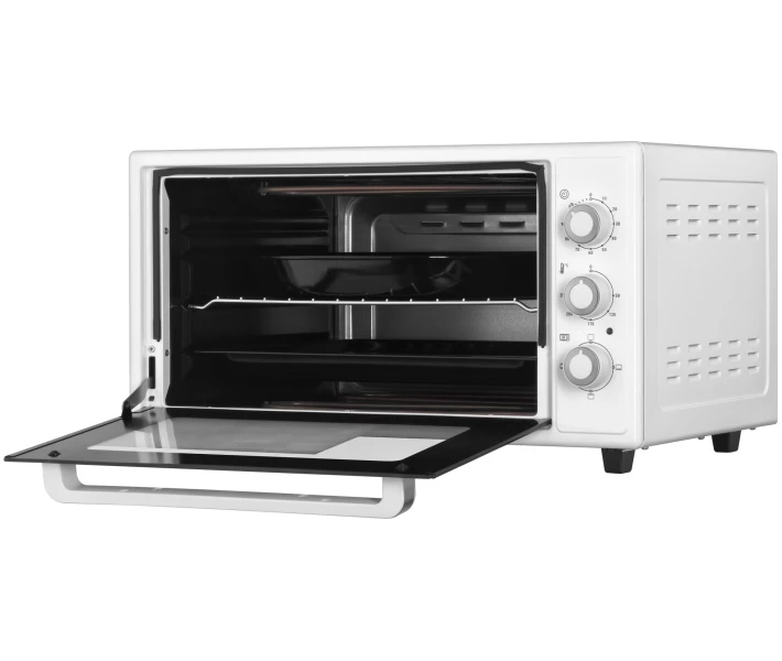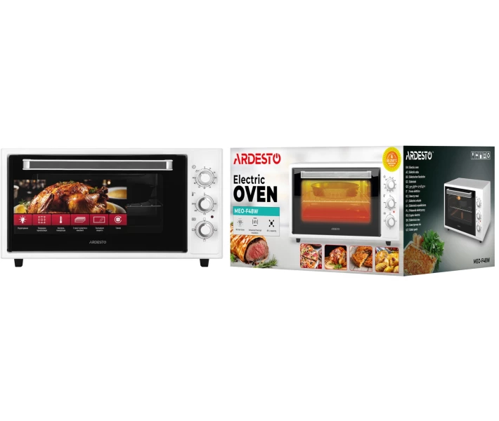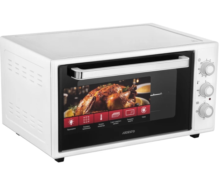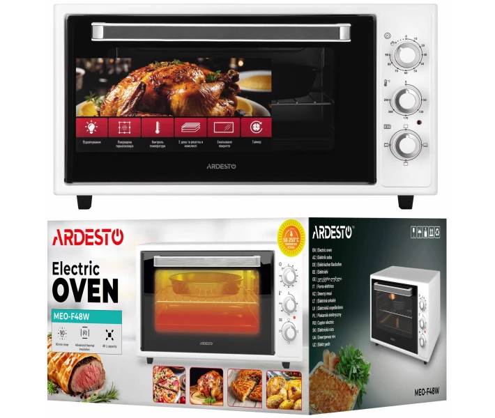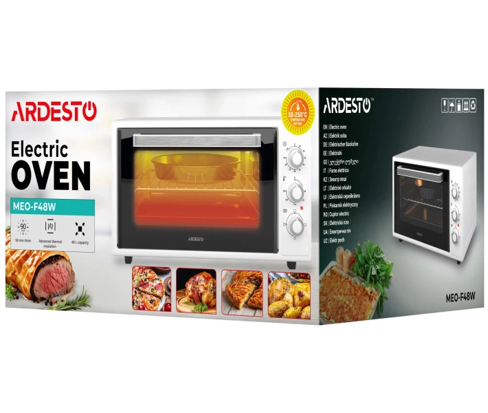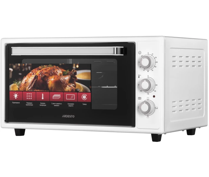 Електрична піч ARDESTO об'ємом 48 л має потужність 1618 Вт, що забезпечує рівномірне приготування при температурі від 50 до 250 °C. Також є 4 режими приготування, таймер до 90 хв та індикатор завершення процесу, які допомагають точно контролювати час приготування.