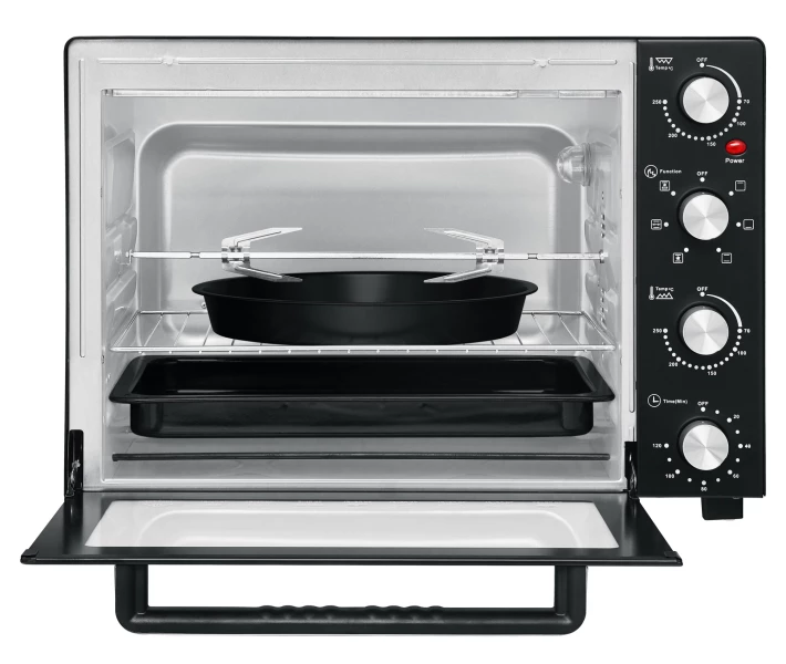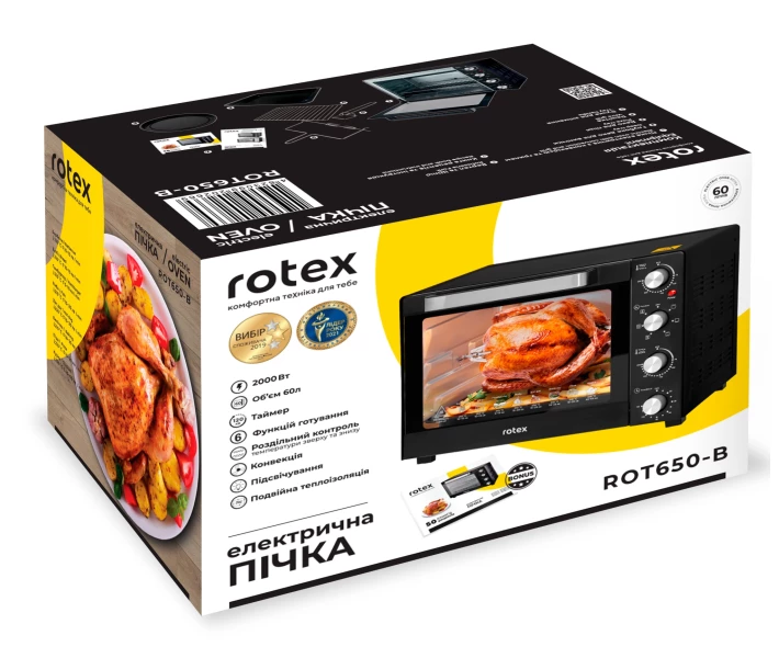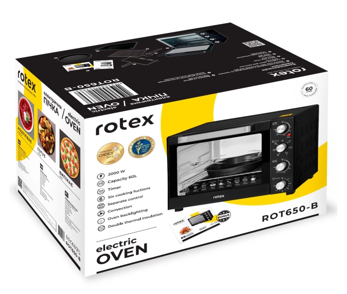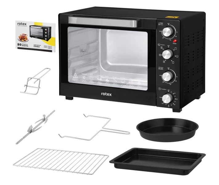 Купуючи духовку Rotex ROT650-B немає необхідності в додатковому інвентарі для приготування. Вхідні в комплект круглий і прямокутний лист дають можливість готувати все, від тортів до цілих великих шматків м'яса. Веретено для гриля забезпечить рівномірний запікання з кожного боку, в поєднанні з режимом конвекції можна розраховувати на блюдо, не гірше ресторанного. А якщо фантазія вичерпалася, книга з рецептами, яка також входить в комплект, дозволить урізноманітнити сімейне меню.