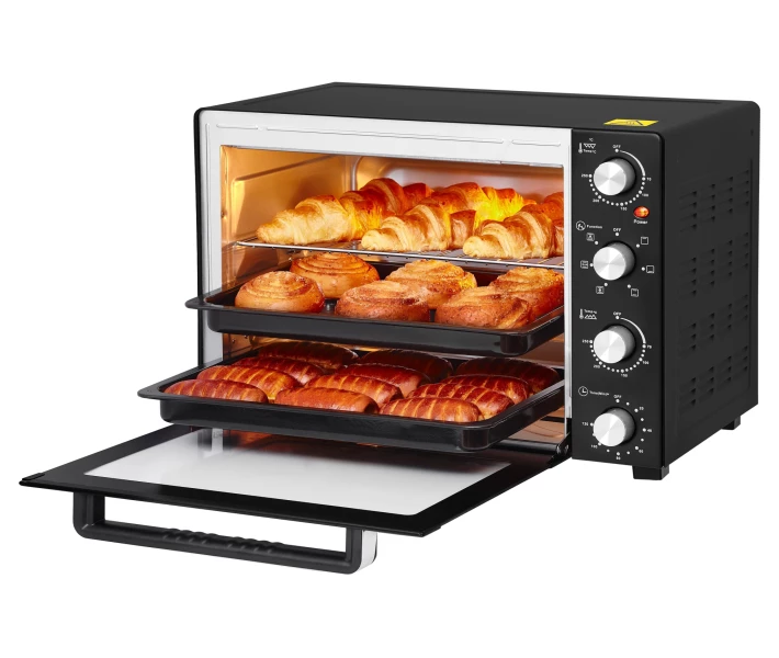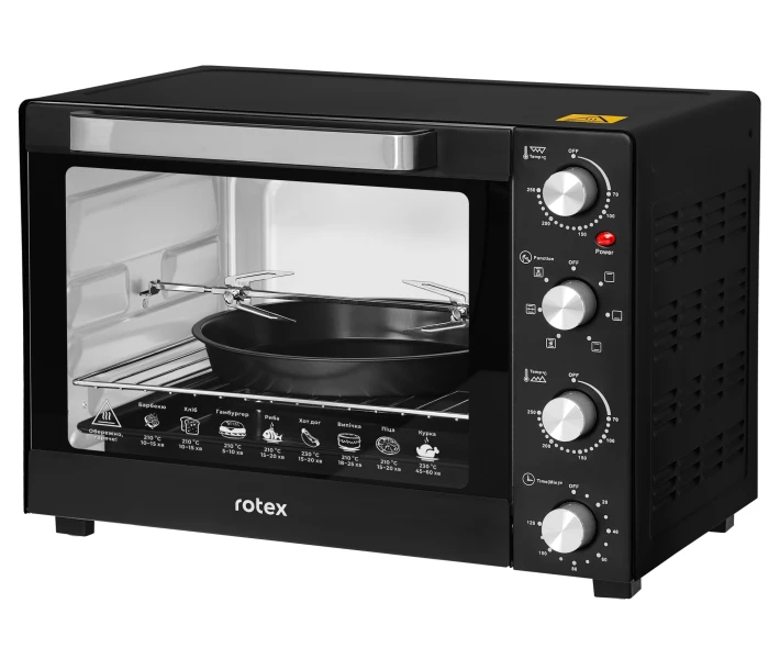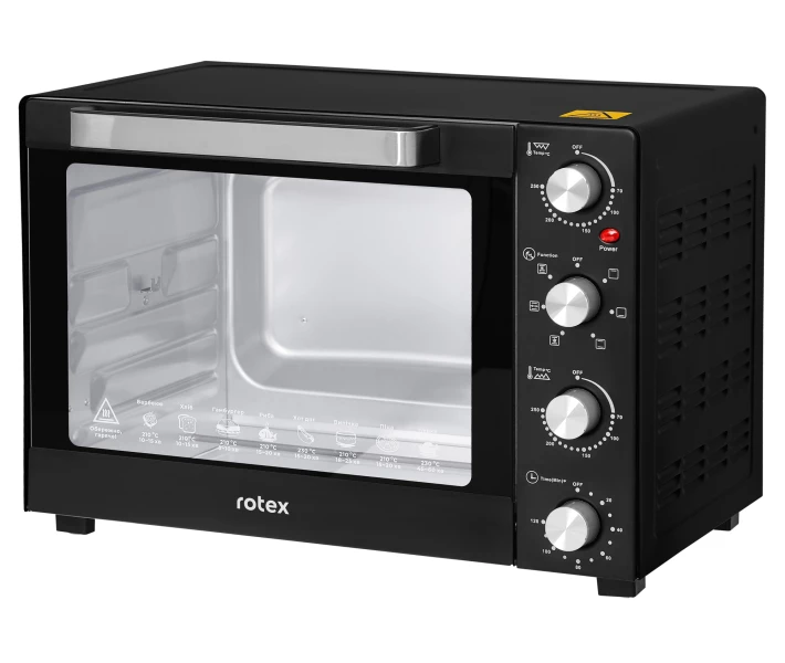 Внутрішній об'єм настільного духової шафи Rotex ROT650-B 60 л дозволять пекти торти, і іншу випічку будь-якої складності. Також ці параметри достатні для запікання птиці цілком, навіть в рамках підготовки до великих сімейних свят. Різні режими роботи дають можливість вибирати між верхнім і нижнім нагрівом або використовувати їх комбінацію. Режим конвекції, який включається за бажанням, гарантує апетитну золотисту скориночку на будь-яких видах страв. Регулювання температури від мінімальних 70 і до максимальних 250 градусів дає можливість з однаковою легкістю швидко запікати м'ясо або сушити вимогливі пастилу і безе. Таймер дозволить задати необхідний час приготування і подасть сигнал, коли процес буде завершений.