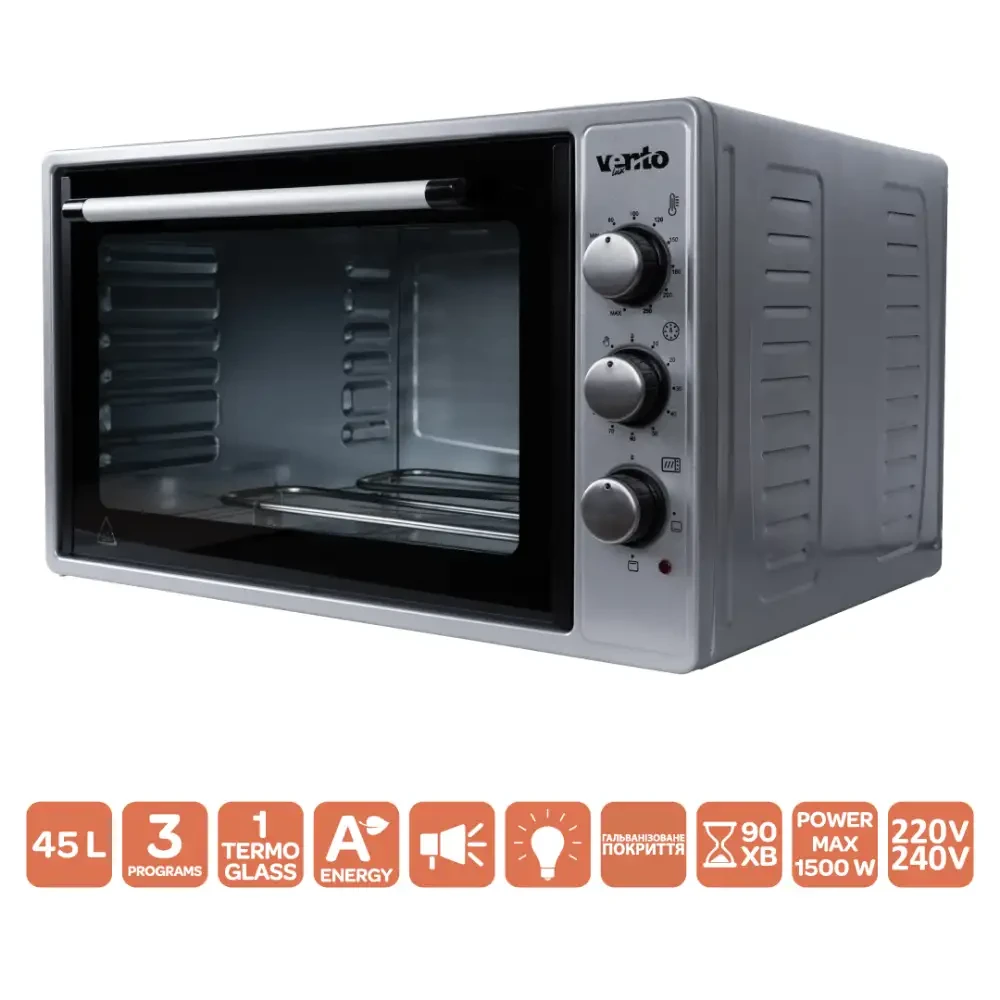 Електродуховка Ventolux MARIA 45 (GRS) — компактна настільна електрична духовка для кухні, яка поєднує простоту використання, універсальність приготування та привабливий дизайн у стилі нержавної сталі. Вона ідеально підходить для тих, кому потрібна повноцінна духовка без вбудовування, але з меншими габаритами.