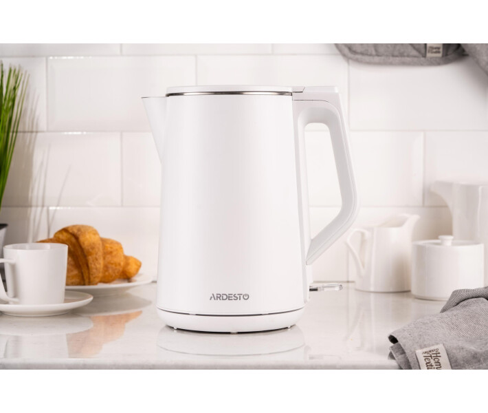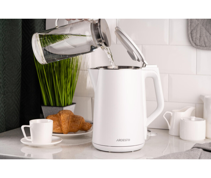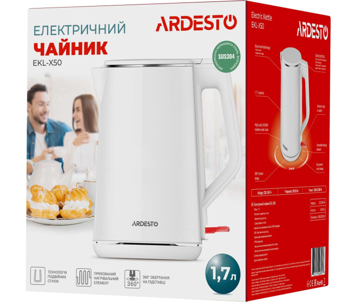 Елегантний електрочайник ARDESTO EKL-X50 має об'єм 1,7 л, оптимальний для сім'ї із 4 осіб. Корпус мінімалістського дизайну із подвійними стінками. Оснащений прихованим нагрівальним елементом, що гарантує тривалий термін служби. При потужності 1850-2200 Вт можна закип'ятити воду в чайнику за кілька хвилин. Безпечний пристрій оснащений функцією Strix-контролю та витримує до 12 000 циклів закипань. У комплектації – бездротова база із обертанням на 360°. Передбачено захист від увімкнення без води та автоматичне вимкнення при закипанні. Робота чайника супроводжується світловою індикацією. Модель має ручку для зручного використання як лівою, так і правою рукою. Завдяки корпусу білого кольору із безпечного та міцного пластику буде доречним на будь-якій кухні.