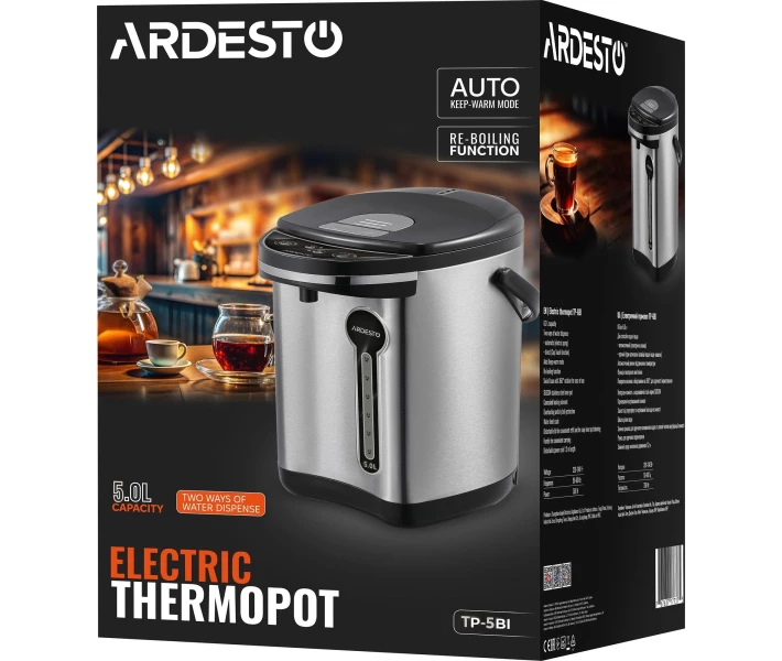 Термопот працює при напрузі 220-240 В ~, а його потужність становить 750 Вт, забезпечуючи швидке нагрівання води. Купити Ardesto TP-5BI Ви можете оформивши замовлення у нас на сайті, а також за телефоном гарячої лінії.