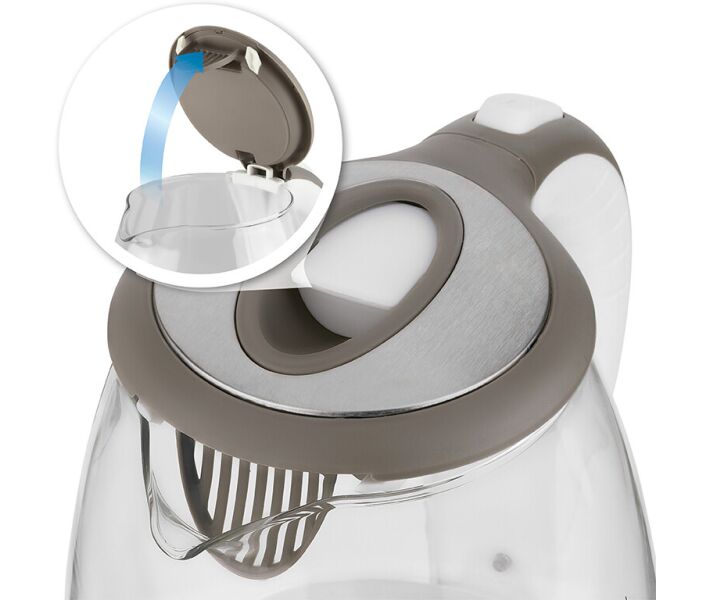 Кришку чайника відкрити випадково неможливо. Для цього потрібно натиснути спеціальну кнопку, яка втоплена всередині самої кришки. Конструкція проста і ефективна. Великий діаметр дозволить наливати воду з будь-якого посуду, не розплескати її при цьому.
