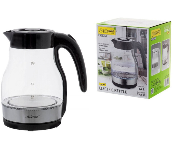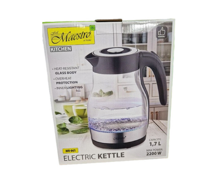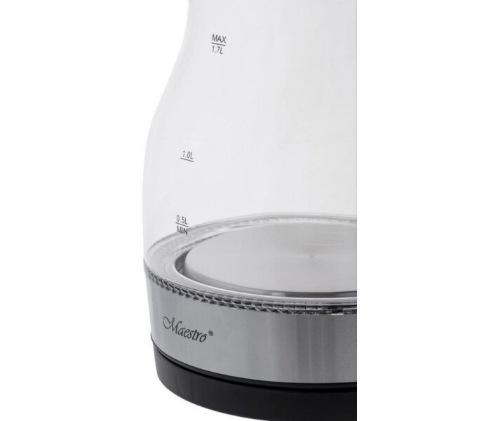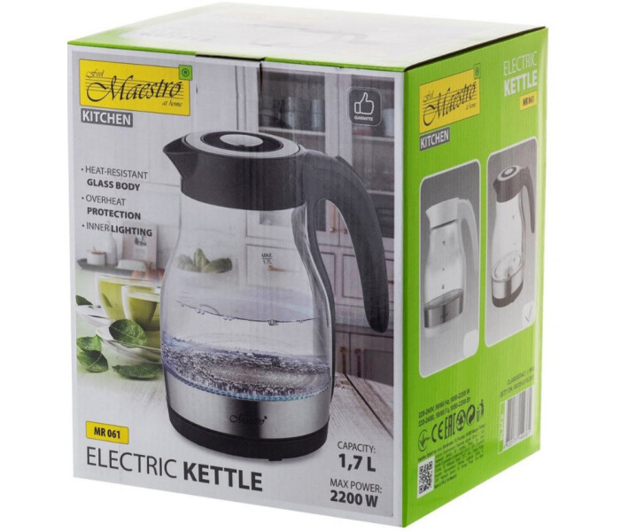 Дисковий скляний електрочайник Maestro MR-061 1.7 л 2000 Вт Електрочайник скляний Maestro MR-061 - це стильний і сучасний аксесуар для вашої кухні. Він виготовлений з прозорого термостійкого скла з приємним підсвічуванням.