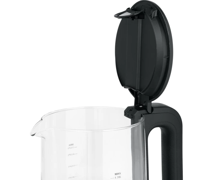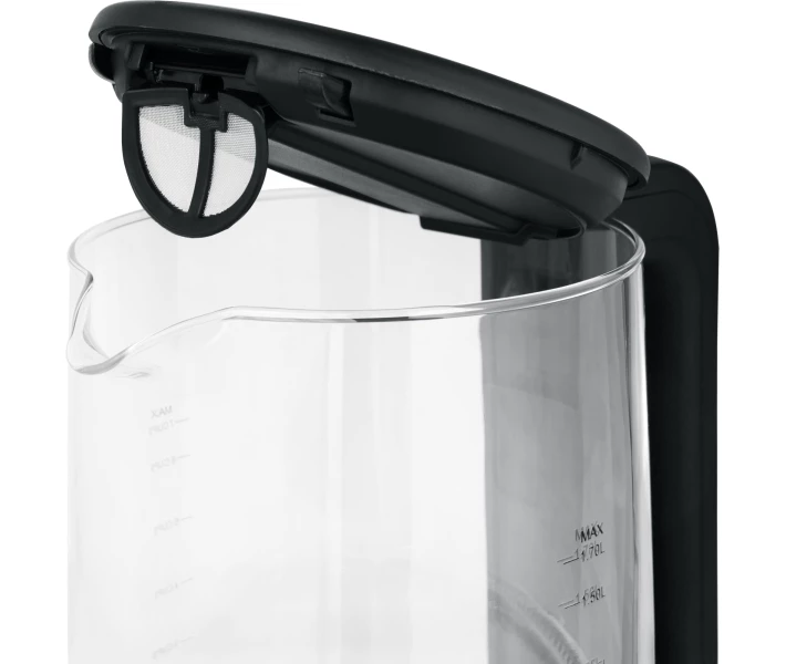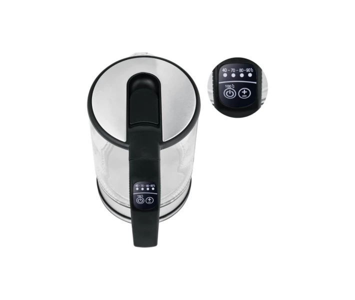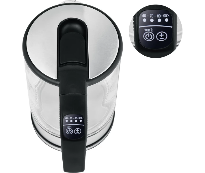 Живлення - 220-240В, 50Гц. потужність 2200Вт, ємність 1,7 л. електронне управління, операція з двома кнопками: легко та коректно, регулювання температури води 60, 70, 80, 90 градусов, кольорові індикатори температури води, підтримка температури води, закритий нагрівальний елемент з нержавіючої сталі, автовідключення при закипанні, поворотна база 360°, зйомний фільтр, захист від протікання, шкала рівня води, LED підсвітка. корпус: термостійке скло, колір пластика: білий.
