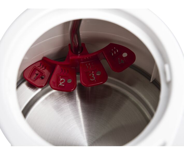 На окрему увагу заслуговує система визначення обсягу води всередині. Корпус не просвічується, тому шкала поділок розміщена всередині. Також в колбі є спеціальне пристосування, яке допоможе зорієнтуватися за кількістю чашок, які можна заварити, маючи той чи інший обсяг води.
