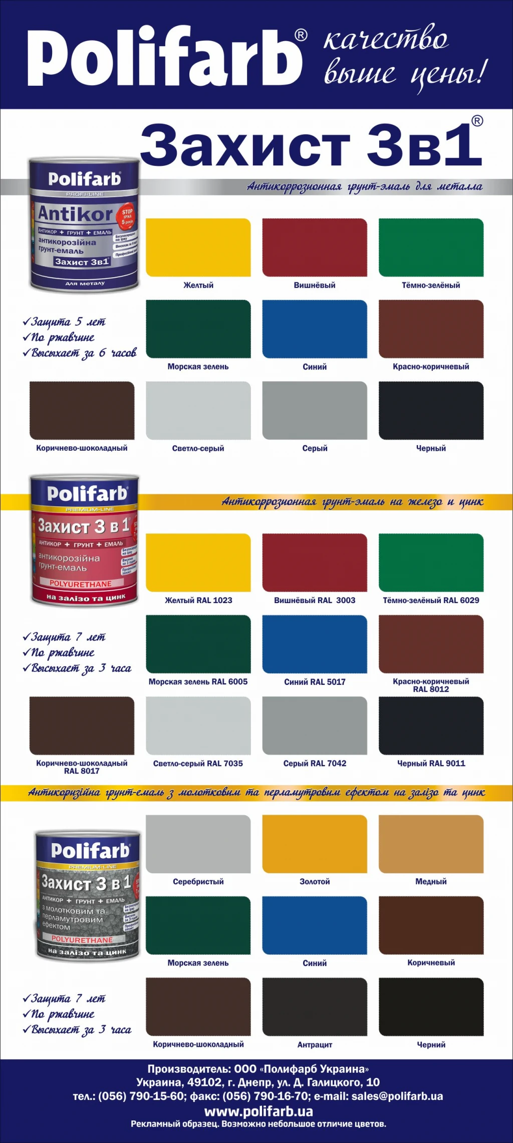 Захист «3в1» з перламутровим і молотковим ефектом ТМ Polifarb - це високоякісна антикорозійна емаль для декоративного та антикорозійного фарбування металевих, оцинкованих виробів. Емаль поєднує властивості перетворення іржі, антикорозійної ґрунтовки, атмосферостійкої емалі. До складу емалі включено три рівні компонентів, для захисту металу від корозії. Після висихання матеріал створює на поверхні оптичний ефект - «молотковий ефект». Емаль особливо підходить для фарбування виробничого обладнання, металевих меблів, воріт, огорож, елементів декоративного оздоблення, сейфів, електроприладів, виробів із чавуну з художнім куванням тощо.