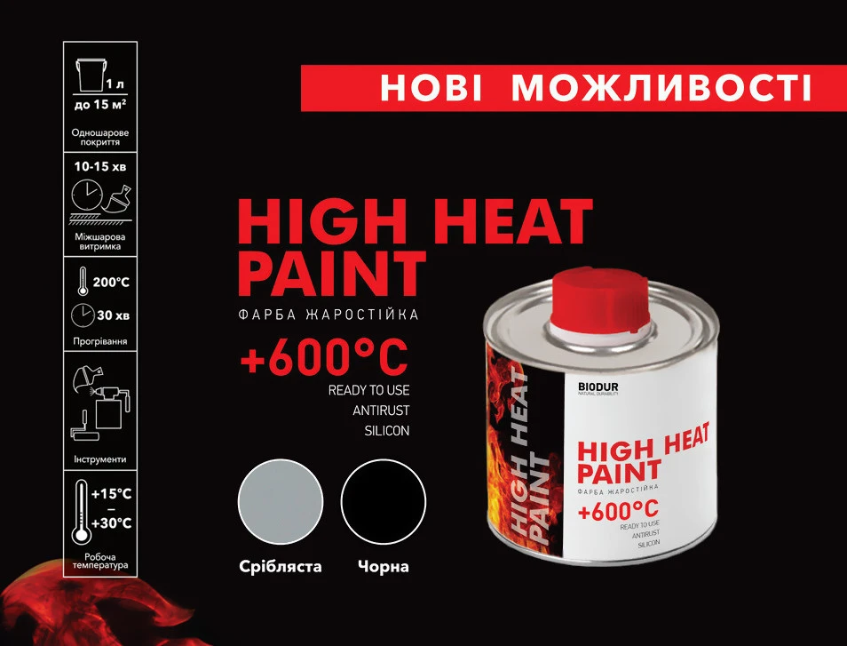 Жаростійка фарба для металевих поверхонь на основі силіконової смоли. Одночасно ґрунтує, фарбує, захищає. Забезпечує тривалий захист металу від корозії. Вирівнює дефекти поверхонь. Має високий ступінь адгезії і відмінну укривистість. Створює надміцне жаростійке покриття. Наноситься на нефарбовані і раніше пофарбовані поверхні. Можна наносити безпосередньо на іржу, яка не відшаровується.