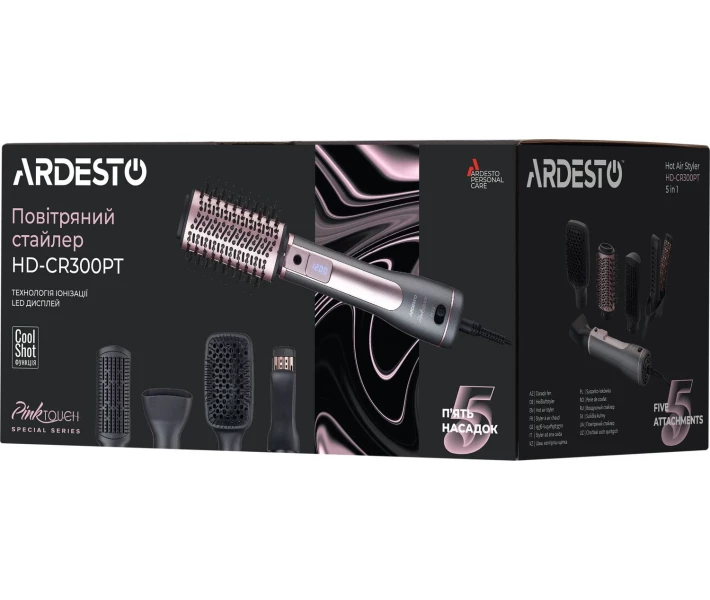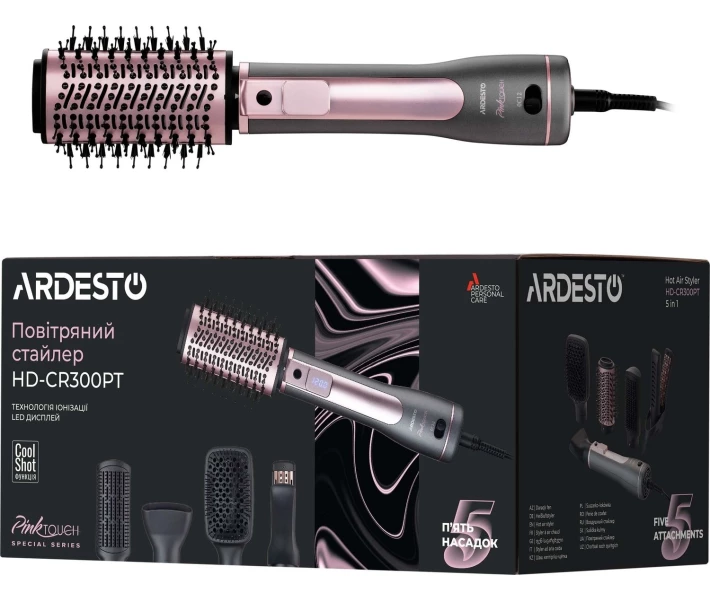 ARDESTO Brush Pink Touch – універсальний інструмент для стайлінгу – має в комплекті п'ять насадок: фен-щітка для завивки, дві фен-щітки для сушіння та надання об'єму, щипці-гофре для створення прикореневого об'єму та концентратор для фена. Завдяки двом температурним/швидкісним режимам та функції Cool Shot цей стайлер надає широкі можливості для створення бажаного укладання. Технологія іонізації гарантує блиск і здоровий вигляд волосся, запобігаючи їх пересушуванню і пошкодженню.