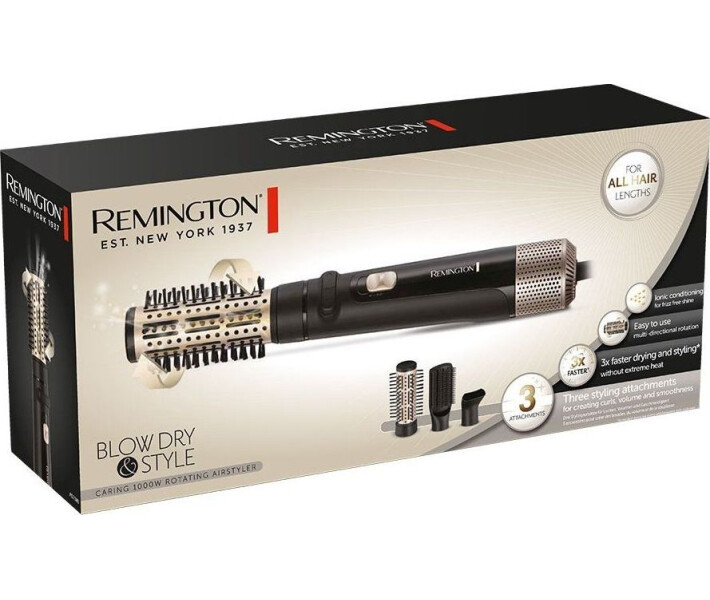 Remington AS7580 Blow Dry and Style Caring розроблений спеціально для створення розкішної укладки з мінімальним тепловим пошкодженням. У комплекті 3 насадки для створення об'єму та легкої завивки або вирівнювання волосся під час сушіння. Тепер ви можете робити укладання у своєму неповторному стилі, що дозволяє завжди та скрізь бути впевненою у собі. Одна з особливостей повітряного стайлера Blow Dry and Style Caring це обертання насадок. Завдяки тому, що стайлер призначений для обертання у двох напрямках, ви можете досягти симетричного укладання з обох боків голови значно швидше. Швидко сушіть волосся з концентратором, створюйте красиві вільні локони з круглою 38-міліметровою обертовою насадкою-щіткою або ідеально рівні зачіски з плоскою насадкою-щіткою. Функція іонізації позбавить волосся від електризації та надасть їм доглянутого вигляду. Стайлер має 2 налаштування швидкості та температури, дозволяючи підібрати поєднання, яке підійде саме вашому волоссю. А третій режим зафіксує готове укладання. Потужність стайлера 1000 Вт забезпечує відмінну продуктивність, дозволяючи щоразу насолоджуватися швидким стайлінгом та професійними результатами. Blow Dry and Style Caring сушить і укладає у 3 рази швидше без пошкодження та перегріву волосся. Купити Remington AS7580 Ви можете, оформивши замовлення у нас на сайті, а також за телефоном гарячої лінії.