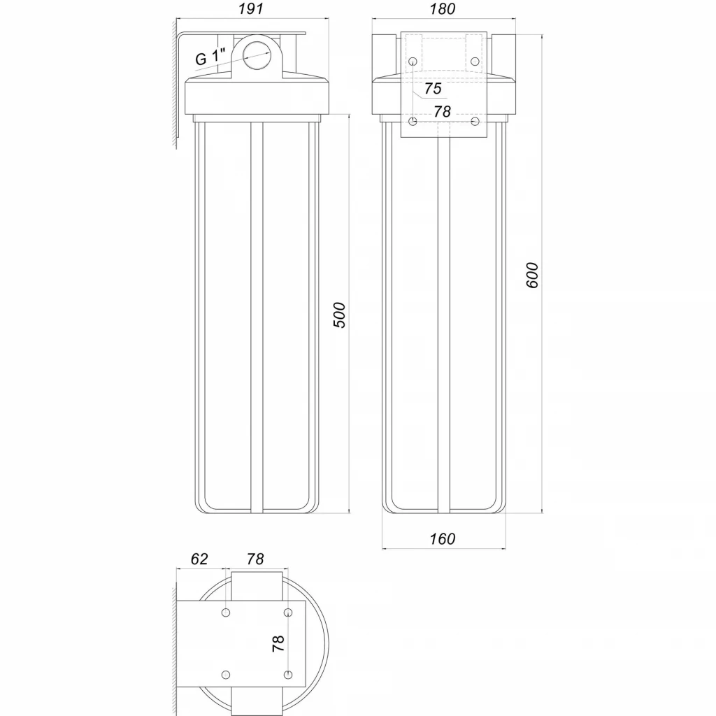 Колба оснащена повітряним скидним клапаном, який необхідний для спрощення заміни картриджів. Фільтр використовується тільки для холодної води. Одна велика колба рівноцінна по витраті води кільком фільтрам менших габаритів.