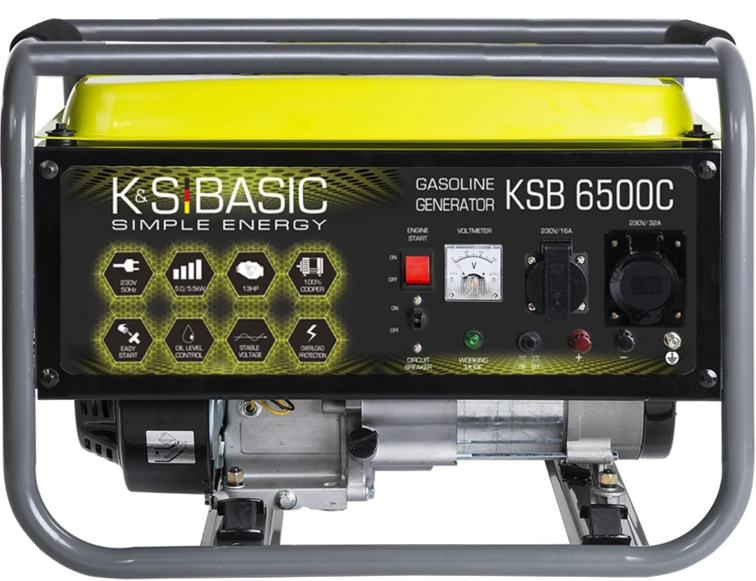Бензиновий генератор K&S BASIC KSB 6500C — надійне автономне джерело електроенергії для дому, дачі або будівництва. Працює від бензинового 4-тактного двигуна, забезпечує стабільну потужність до ~5,0–5,5 кВт, обладнаний AVR-регулятором для стабілізації напруги та зручними виходами 230 В. Простий у використанні та обслуговуванні, ідеальний при відключеннях електрики або на виїздах.
